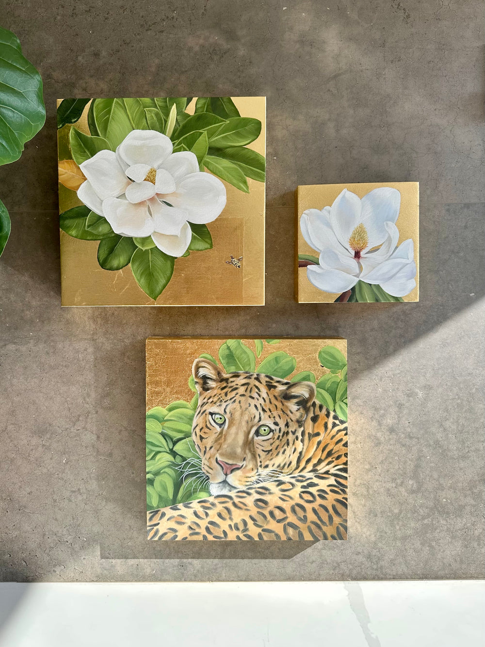 All the paintings in the Golden Hour collection were created using high-quality oil paints and metal leaf on deep wood panels.
