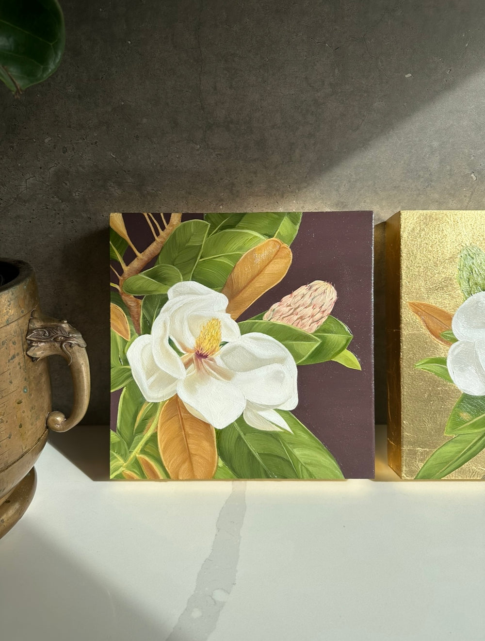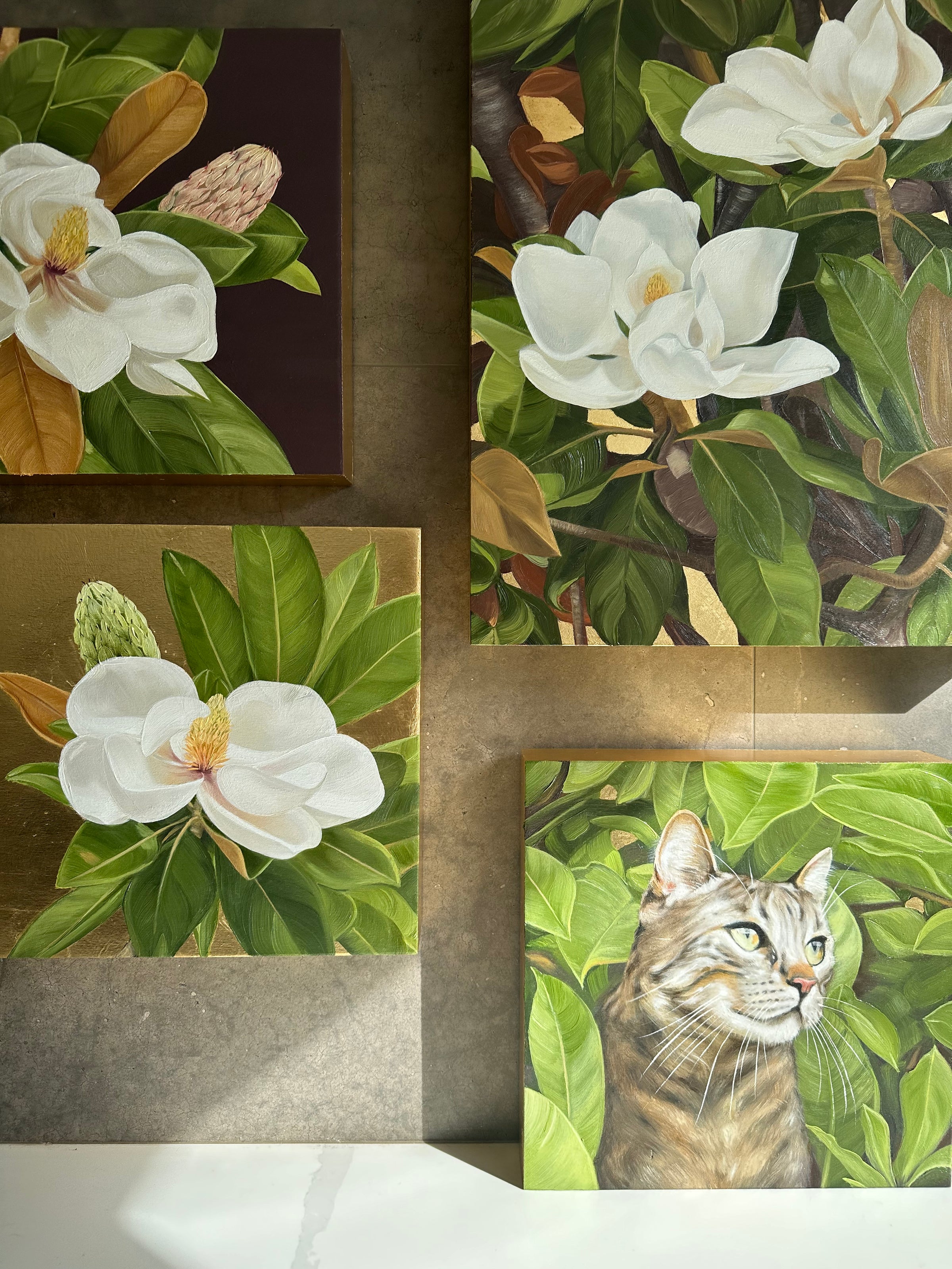 Paintings featuring the ancient magnolia, a harbinger of spring since before the buzz of bees.