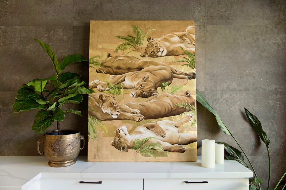 Languid lionesses rest among sun-kissed ferns in this dreamy cuddle puddle. Glimmering gold embraces them in its warmth.