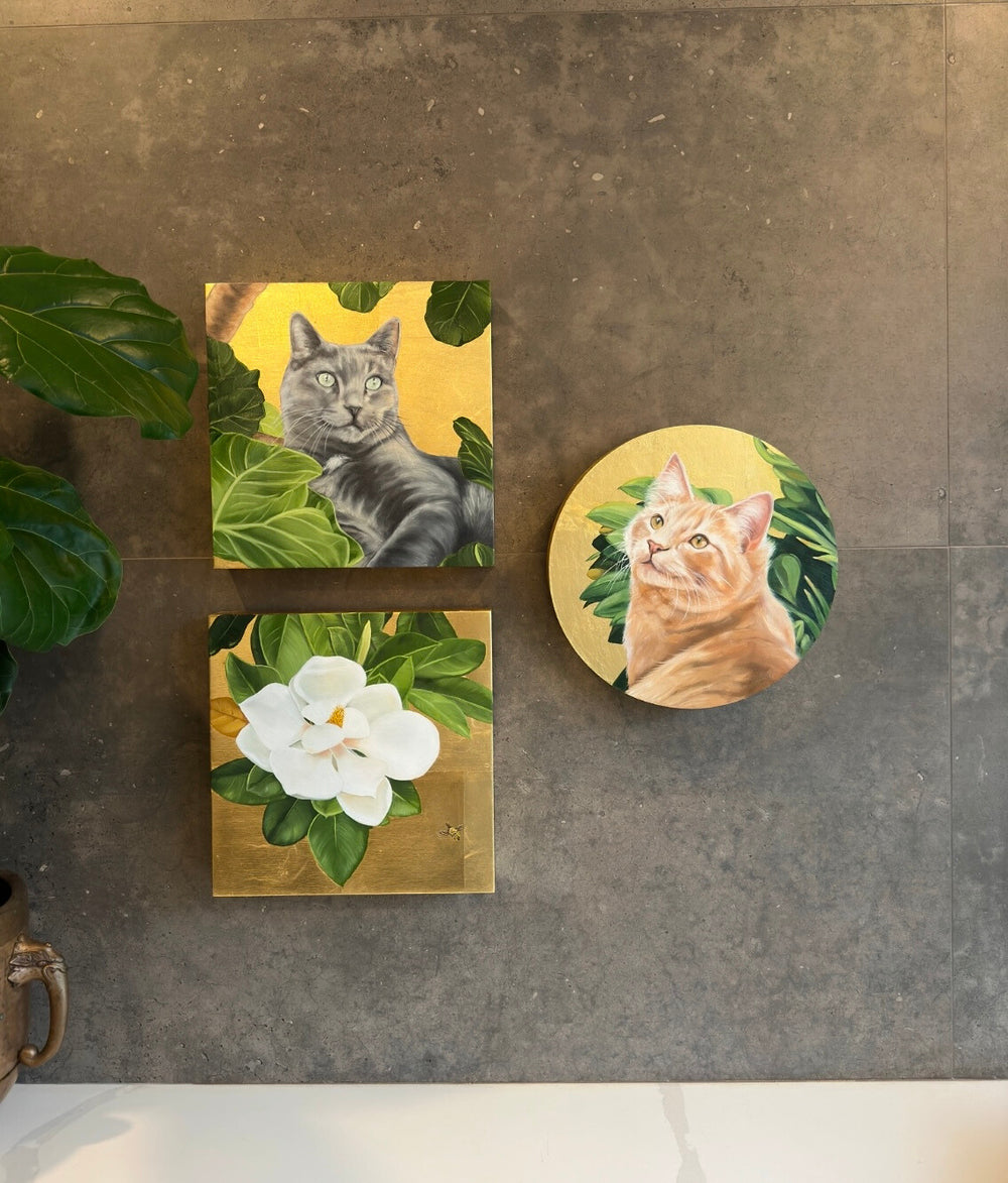 All the paintings in the Golden Hour collection were created using high-quality oil paints and metal leaf on deep wood panels.