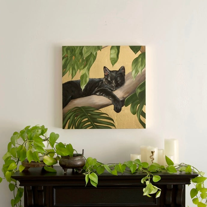 This original oil painting on custom wood panel measures 24 x 24" with a 2.25" edge and is gilded with metal leaf.