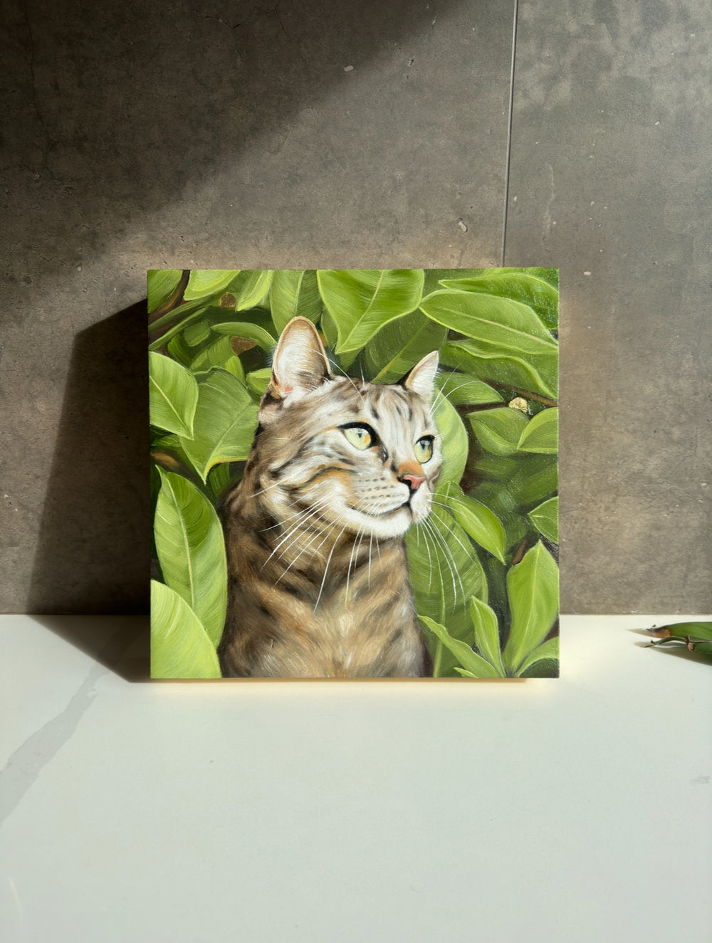 Enrobed in magnolia leaves, a sweet feline gazes out at the gift of new Spring life.