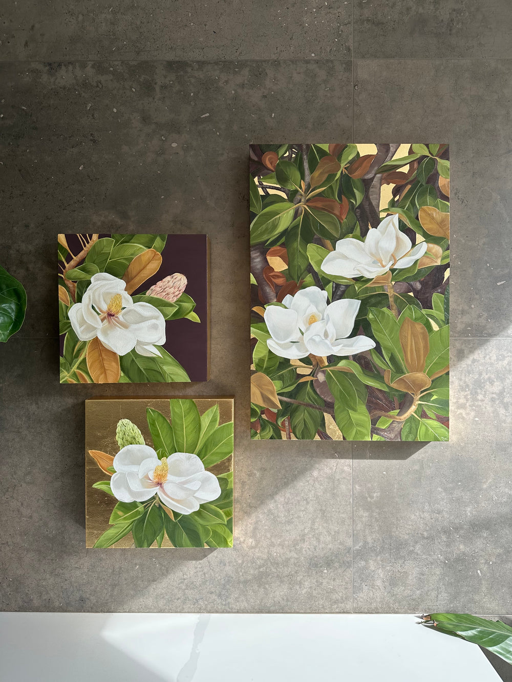 Paintings featuring the ancient magnolia, a harbinger of spring since before the buzz of bees.