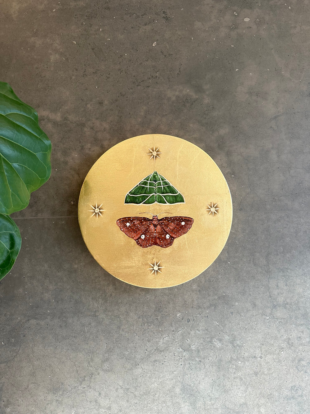 This original oil painting on wood panel measures 12" round with a 1.5" edge and is gilded with metal leaf.