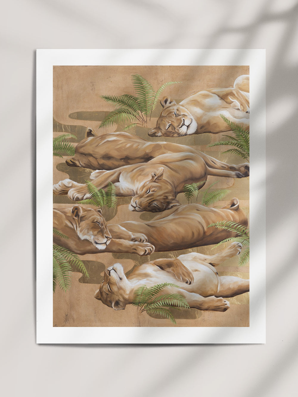 Languid lionesses rest among sun-kissed ferns in this dreamy cuddle puddle. Glimmering gold embraces them in its warmth. This limited edition print of "Bend to the Light" by Gillian Lahav will remind you to always turn your face to the sun.