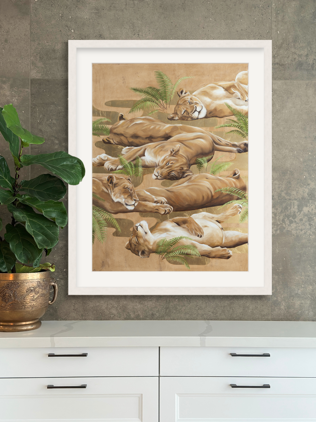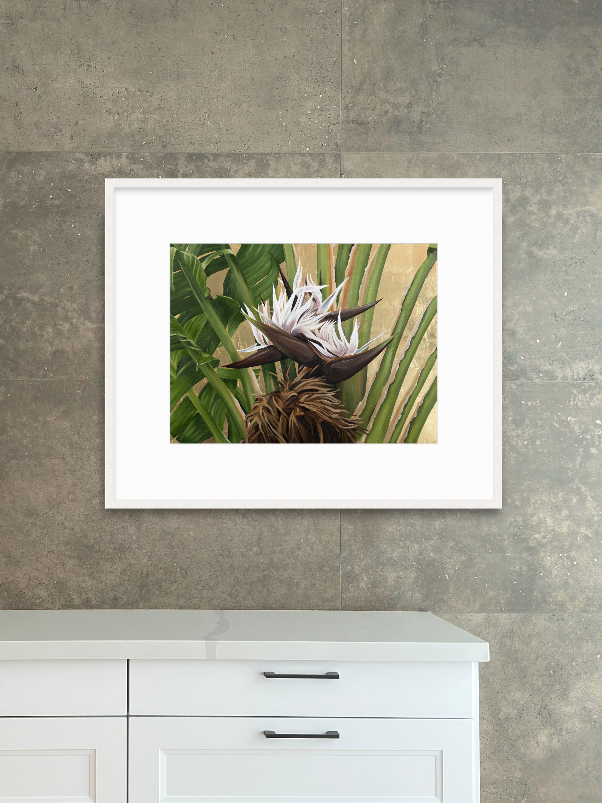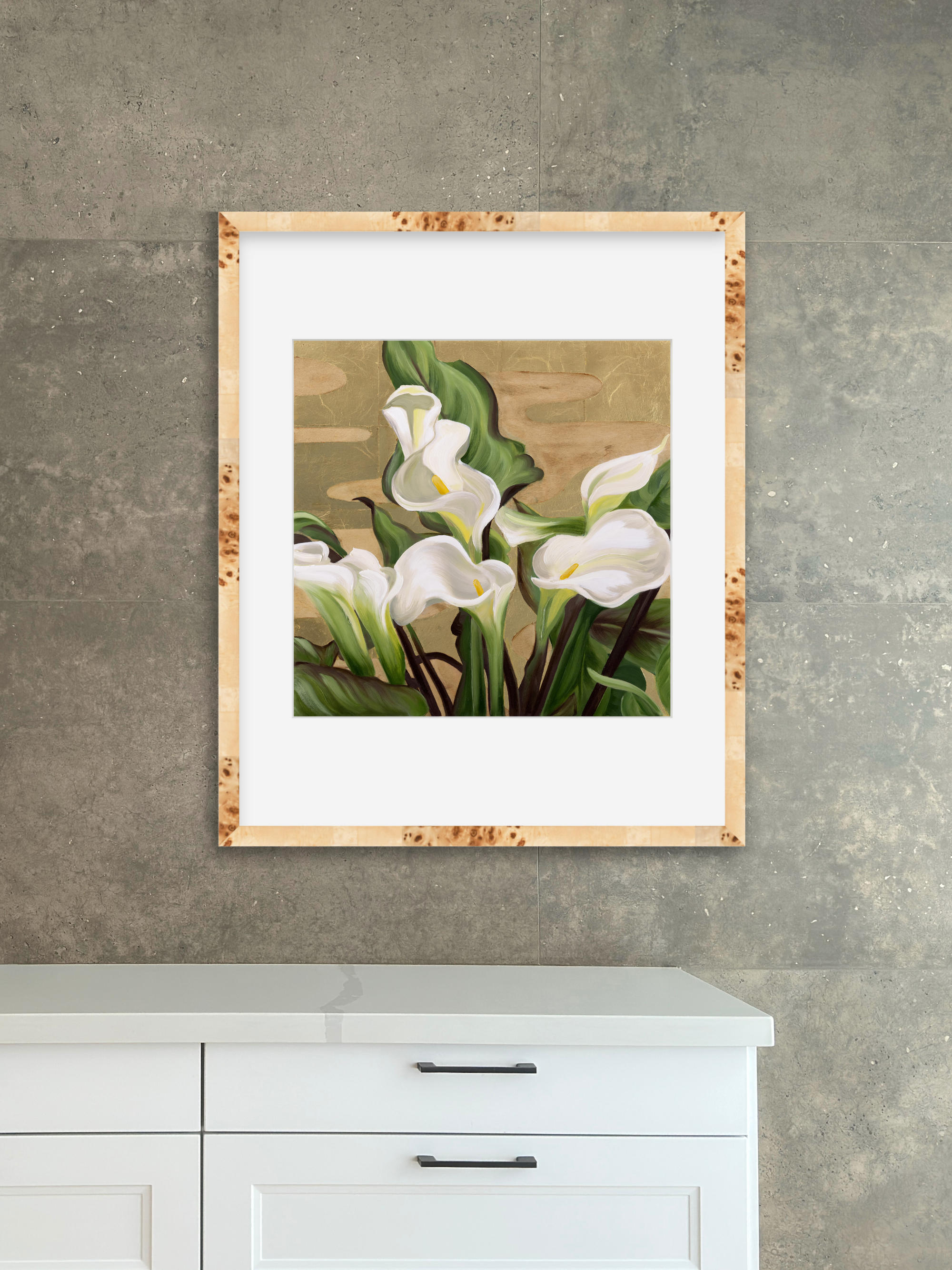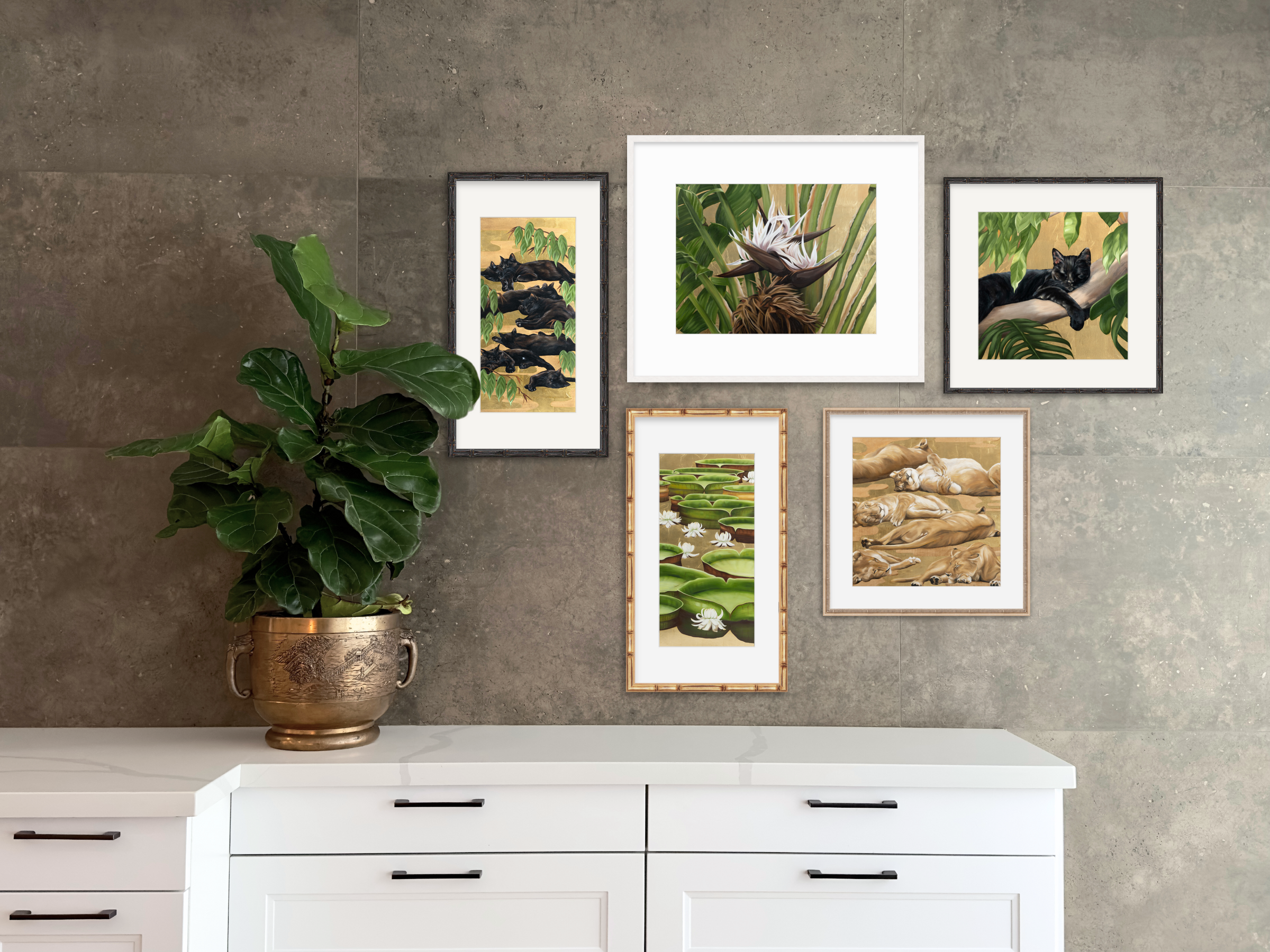 I recommend gold, natural wood, gallery white, or unusual textured black frames for most of my artwork. Think burl wood, sandcasted black bronze, or gold bamboo for a vintage feel. My paintings and the prints that are created from them are full of warmth and natural textures. Pair your print with a frame that matches this aesthetic and it is going to look gorgeous!